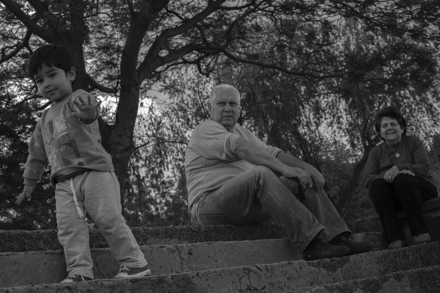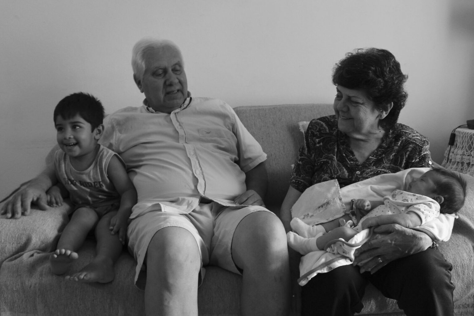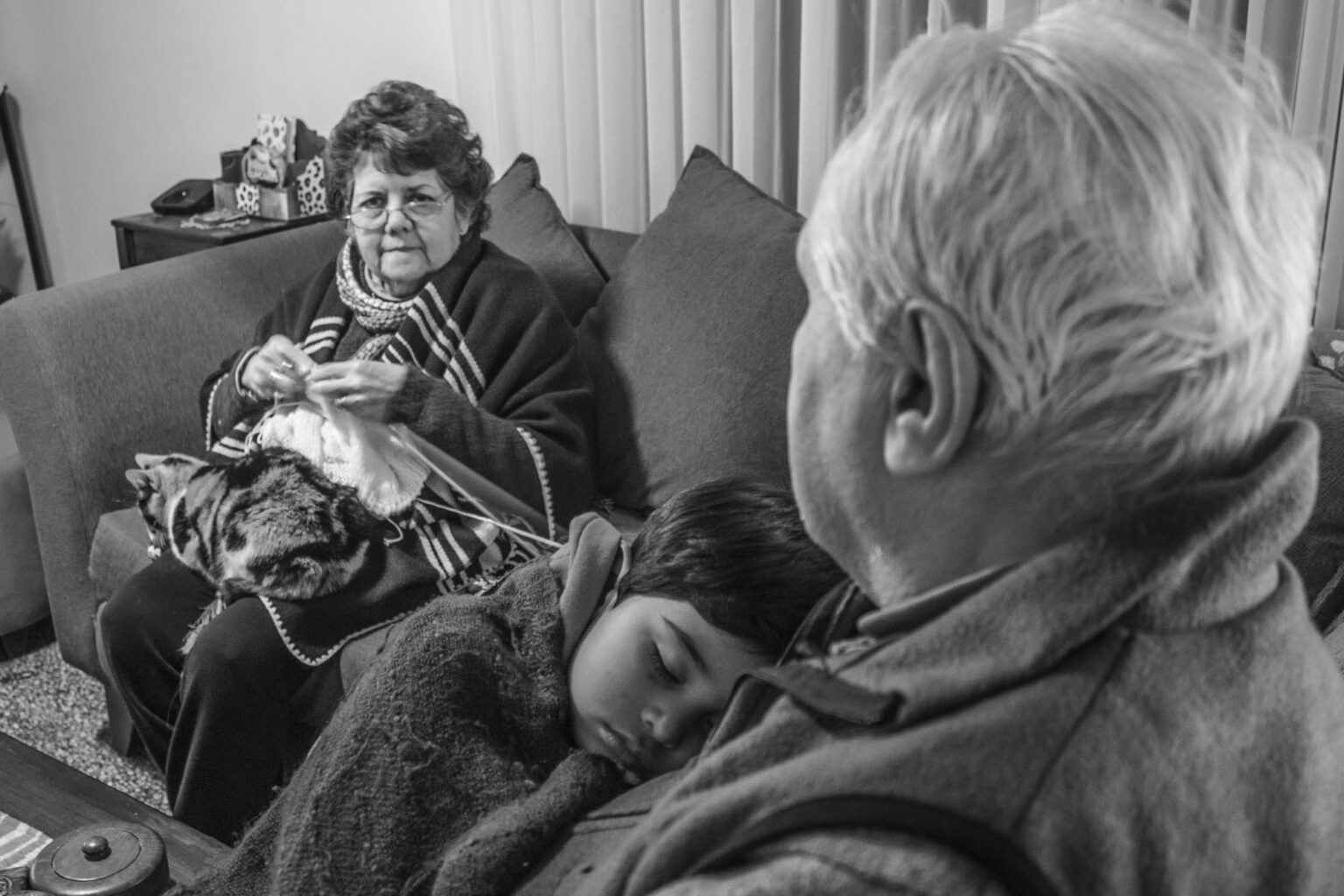 Abuelos mirando tele y cuidando a su nieto -Invierno de 2017